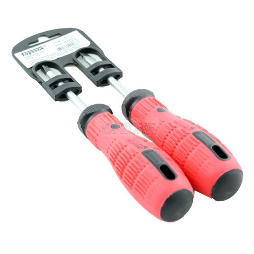 Topzone 11-TT33A, 2-Piece screwdriver Set comprises of 1 Flathead and 1 Phillips screwdriver that have a variety of uses. The handles are shaped and sized to provide comfort in the hand and torque in the fastener head. The rubber grip with thumb indents provides ease for prying.